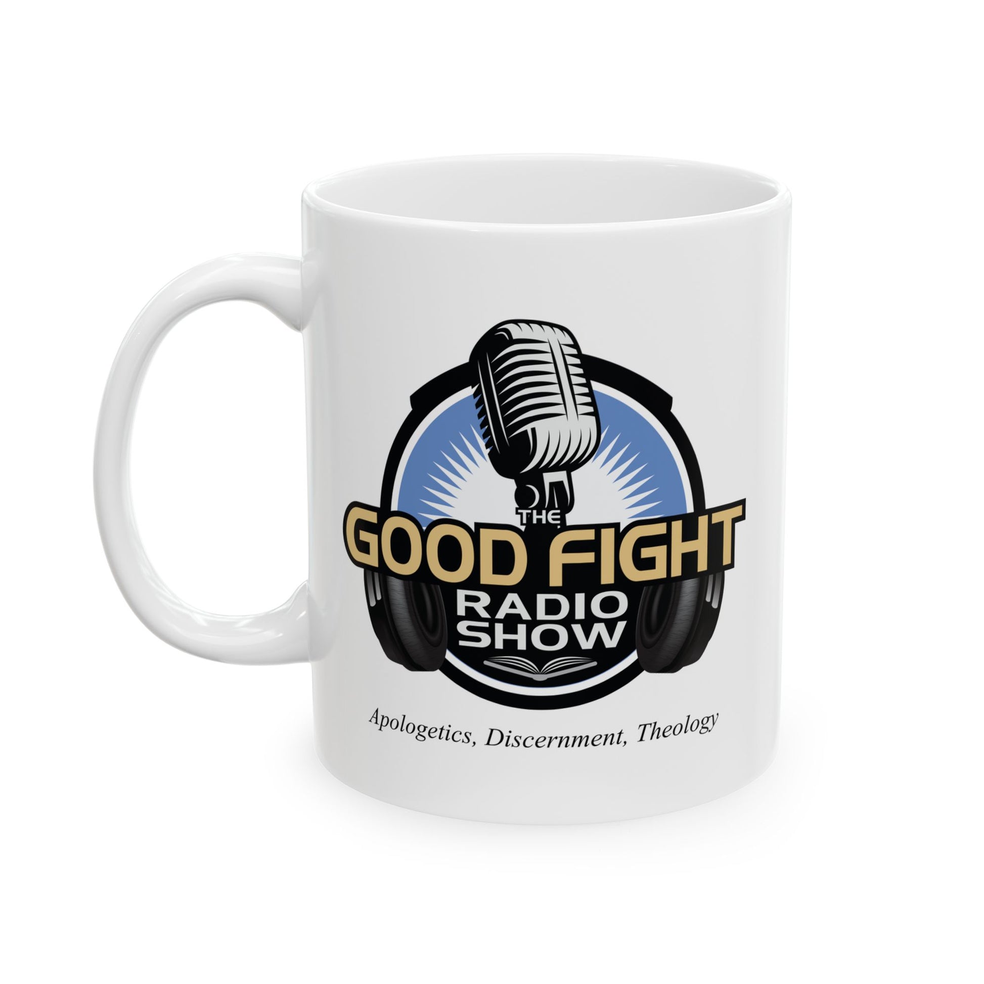 Enjoy your favorite beverages in style with this ceramic mug, designed to brighten your morning routine. Ideal for home or office use, this mug is perfect for coffee lovers, tea enthusiasts, or anyone who appreciates quality drinkware. It makes a fantastic gift for holidays like Christmas, birthdays, or any special occasion where a personal touch is appreciated. Start each day with a cup of coffee or tea in this custom coffee mug while watching or listening to the latest episode of The Good Fight Radio Show.